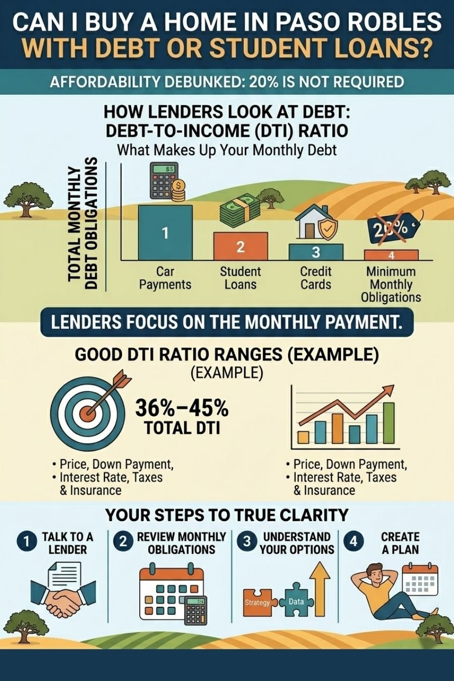 As a real estate agent in Paso Robles, CA helping buyers and sellers across San Luis Obispo County, I work with buyers in this situation all the time. Having debt doesn’t automatically disqualify you, it just changes how lenders evaluate your loan.