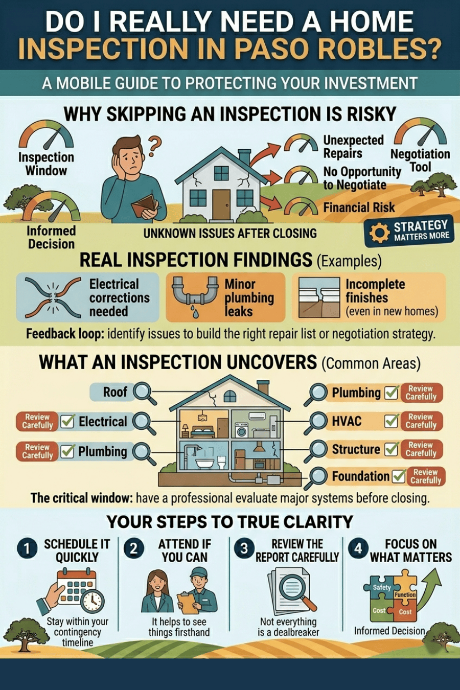 As a real estate agent in Paso Robles, CA helping buyers and sellers across San Luis Obispo County, I’ve seen inspections uncover issues in both older homes and brand-new construction. It’s one of the only opportunities you have to fully understand the condition of the home before you close.