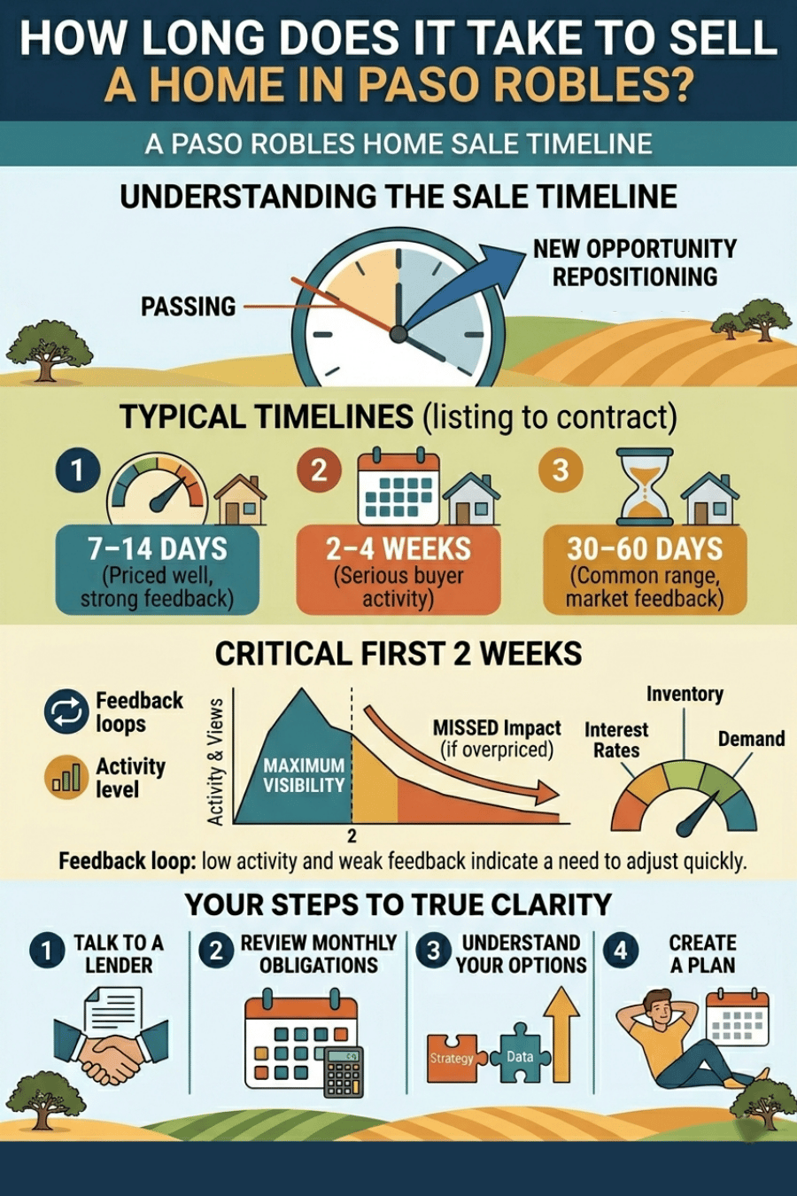 Most homes in Paso Robles sell within a few weeks to a couple of months but it depends heavily on pricing, condition, and strategy.