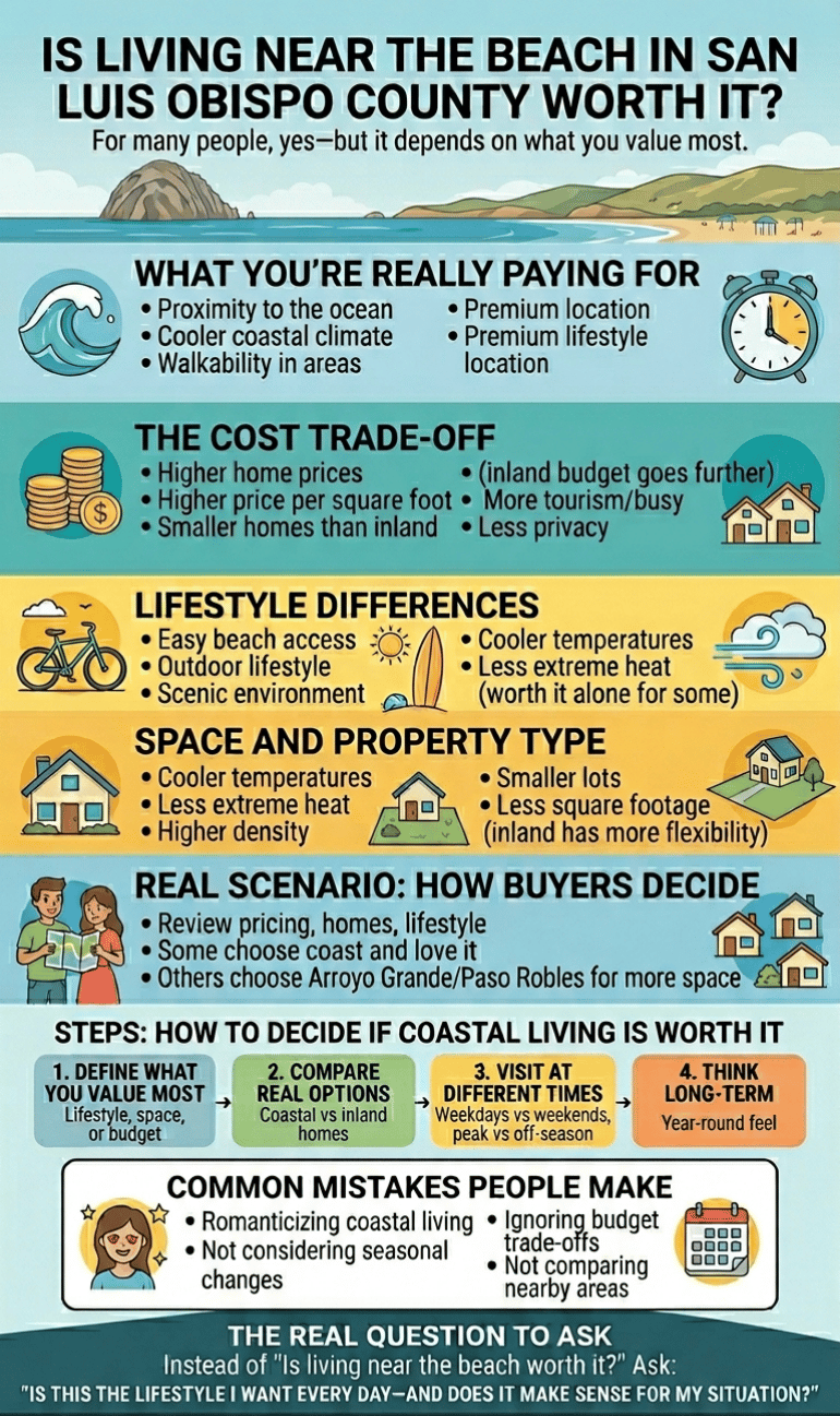 As a real estate agent in Paso Robles, CA helping buyers and sellers across San Luis Obispo County, I’ve worked with buyers who are drawn to the coast for the lifestyle but the decision usually comes down to balancing that lifestyle with cost, space, and day-to-day practicality.