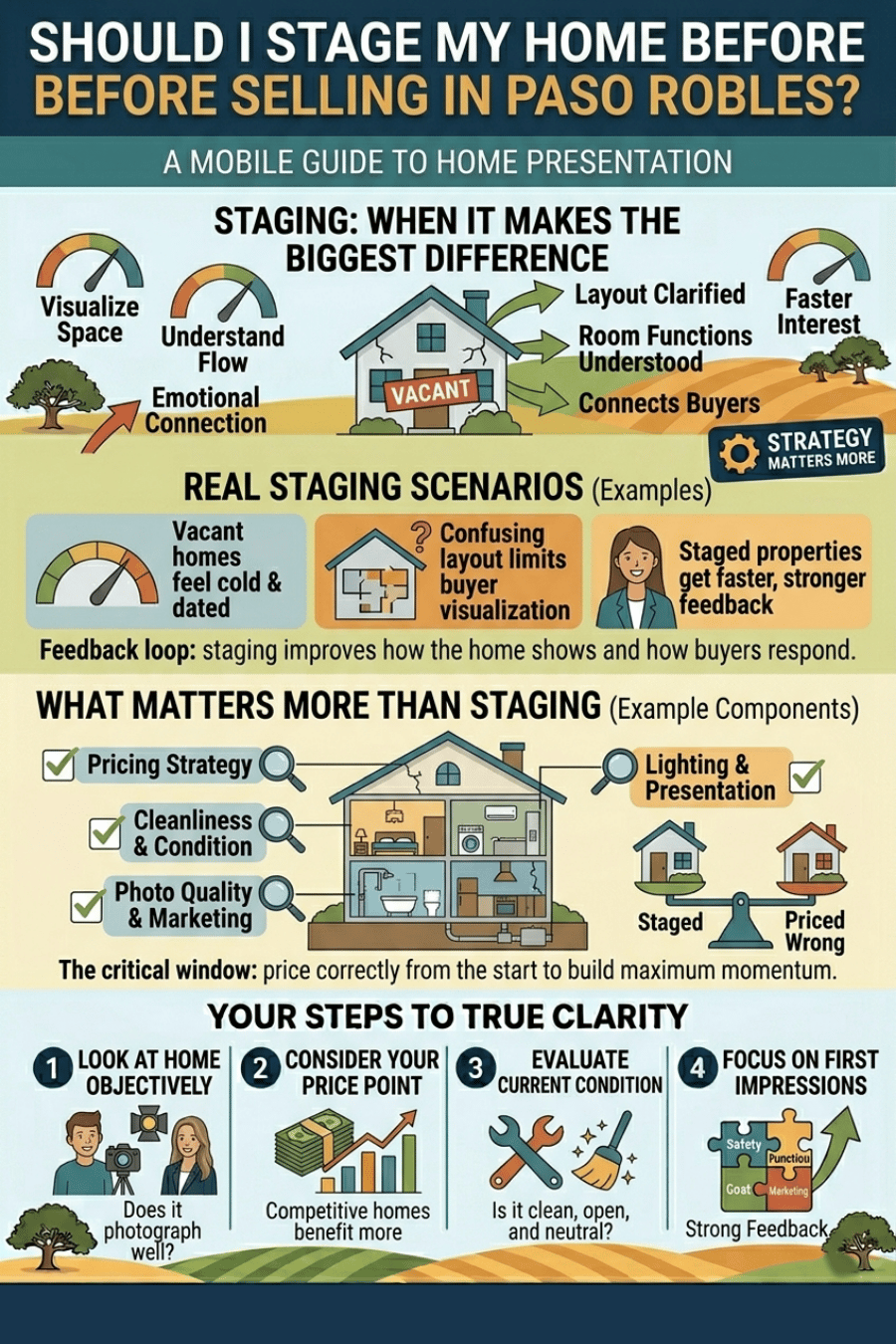 As a real estate agent in Paso Robles, CA helping buyers and sellers across San Luis Obispo County, I’ve seen staged homes perform better in some situations but I’ve also seen homes sell quickly without full staging. It really depends on the property and how it’s being positioned.