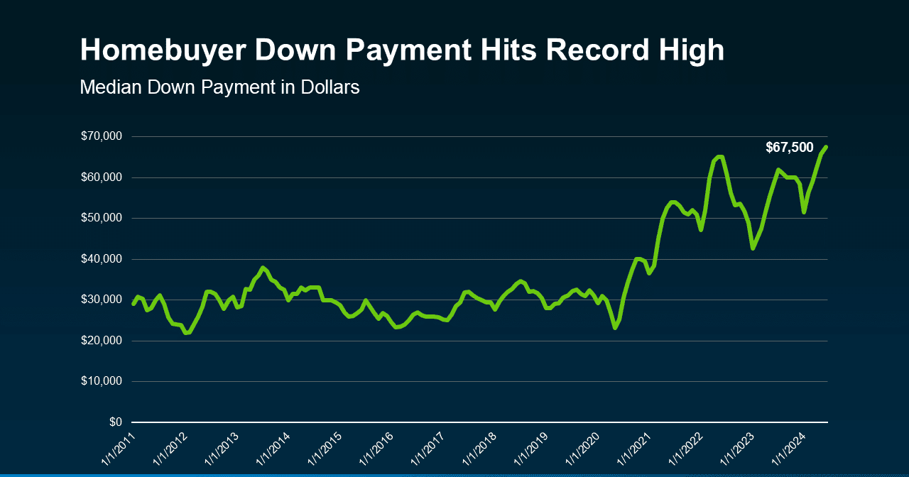 According to the latest data from Redfin, the typical down payment for U.S. homebuyers is $67,500—that’s nearly 15% more than last year, and the highest on record (see graph below):