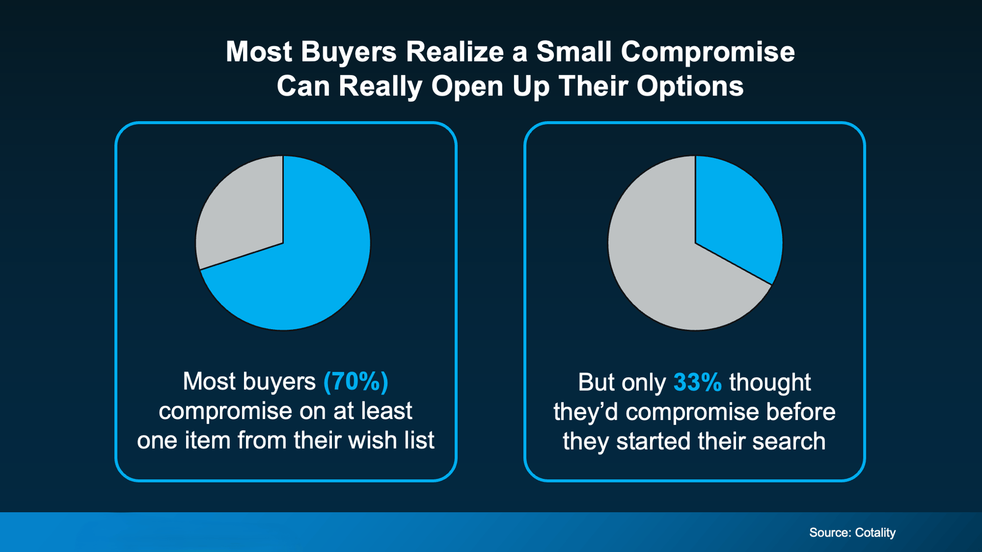 Affordability has been a real challenge the past few years, and buyers are adapting. According to Cotality, 70% of buyers ended up compromising on at least one feature they originally wanted. What’s interesting is that before they started searching, only 33% expected to compromise at all.