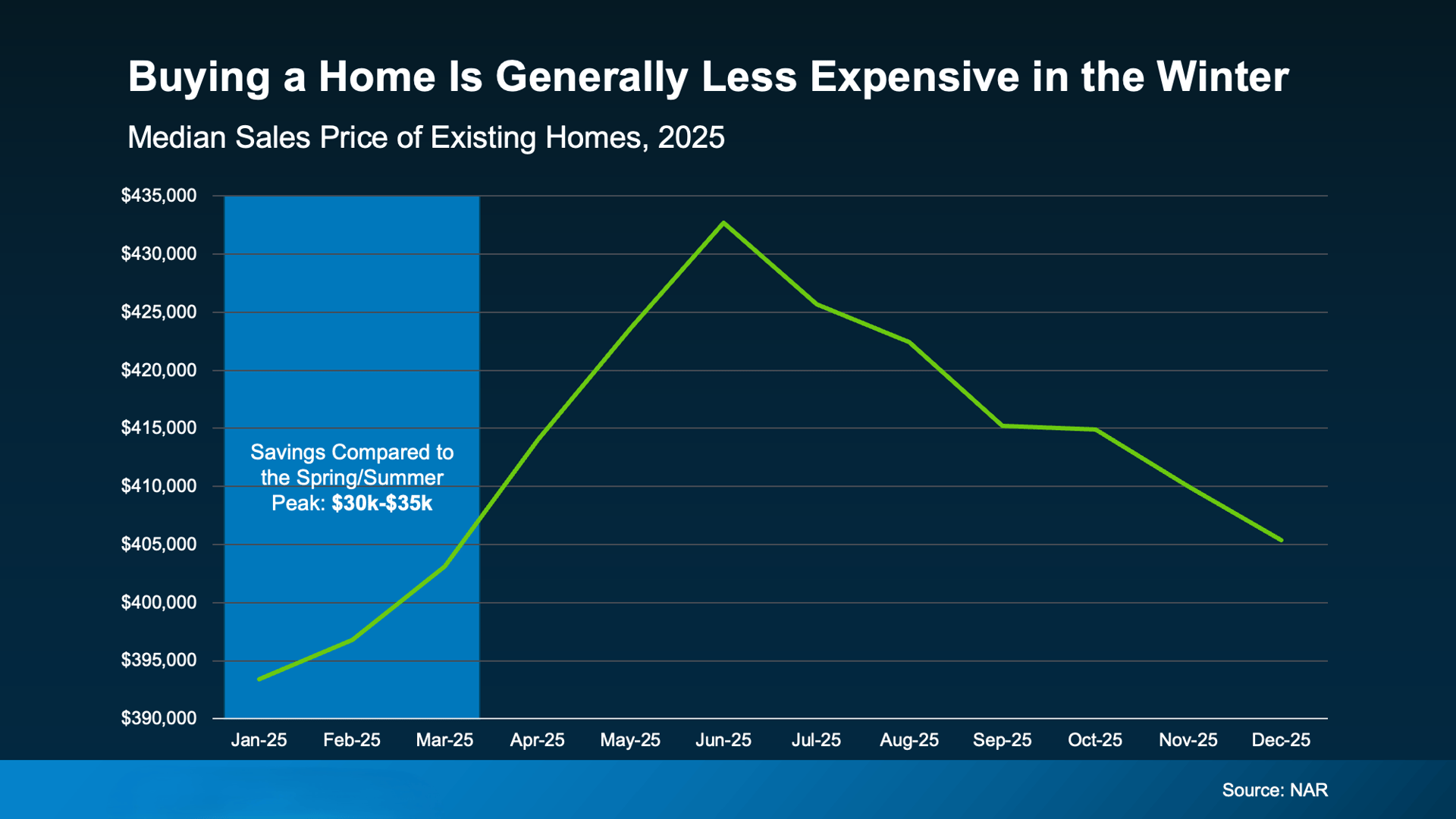 In fact, data from the National Association of Realtors shows buyers who purchased early in the year saved roughly $30,000–$35,000 compared to those who bought when prices peaked in late spring or early summer.