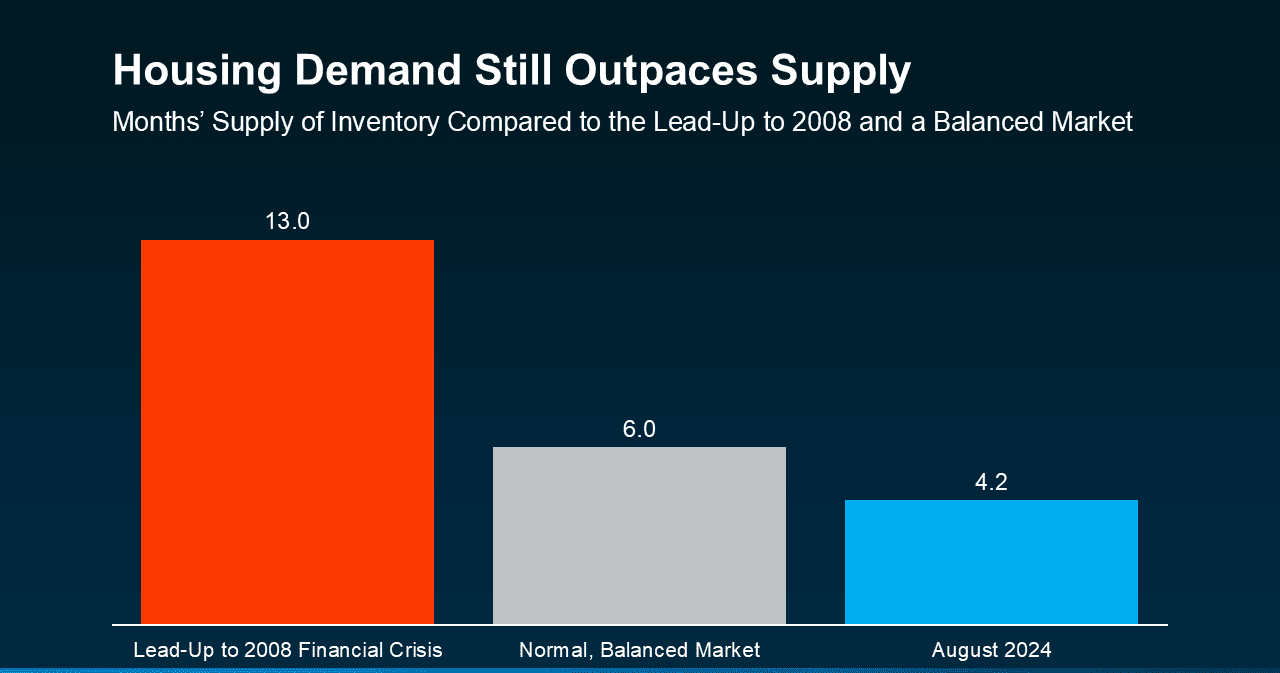 The graph compares housing supply during three different periods of time. The red bar shows there were 13 months of supply before the 2008 crisis, which was far too much. The gray bar shows a balanced market with six months of supply, for context. And the blue bar shows there are only 4.2 months of supply today.