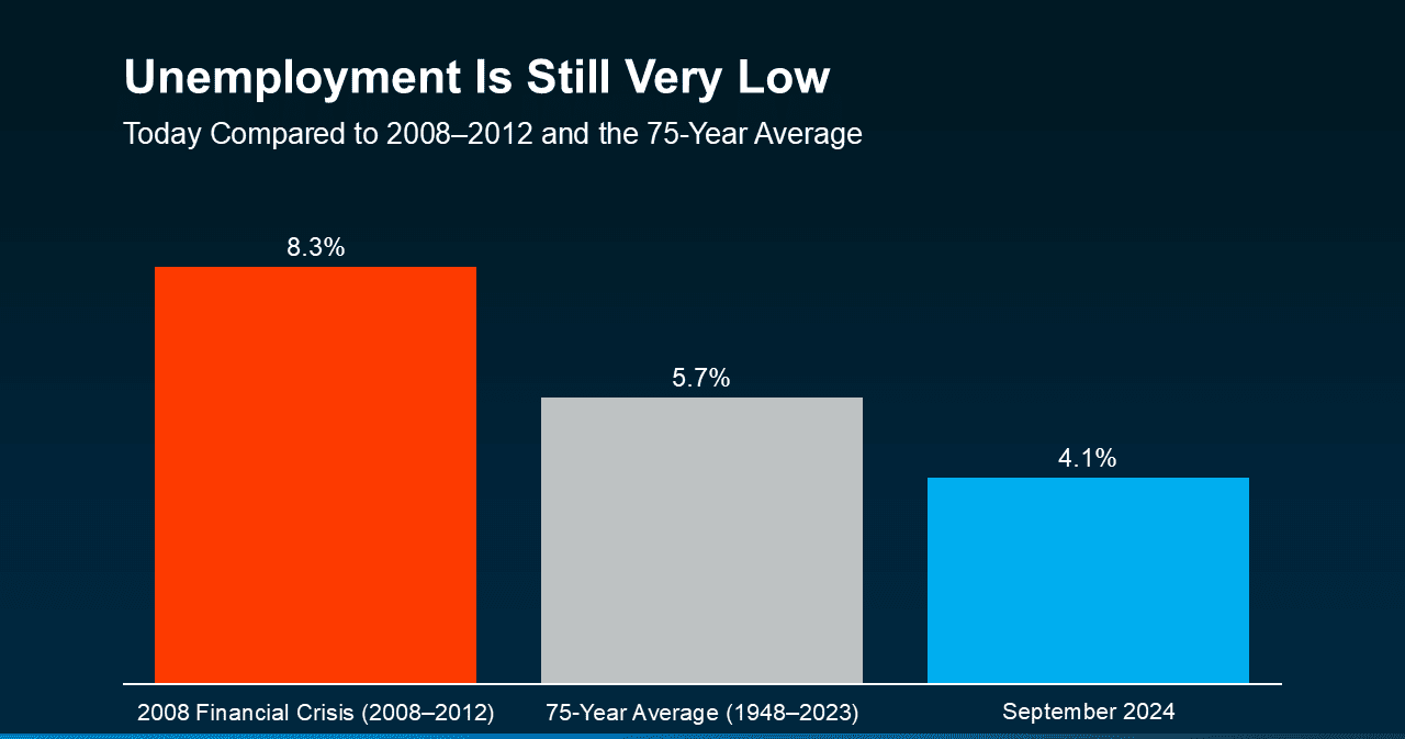 Again, this graph shows three different periods of time, but this one is the unemployment rate. The red bar represents the 2008 financial crisis when unemployment was very high at 8.3%. The gray bar shows the 75-year average of 5.7%. And the blue bar shows the unemployment rate today, and it’s much lower at just 4.1%.