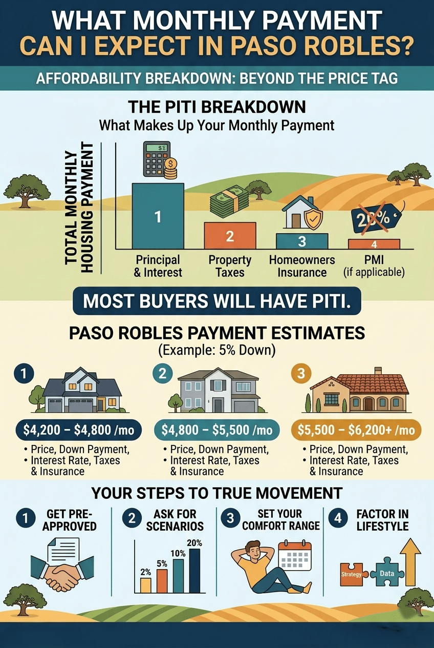 As a real estate agent in Paso Robles, CA helping buyers and sellers across San Luis Obispo County, this is where clarity really matters. The monthly number is what impacts your day-to-day life not just the purchase price.