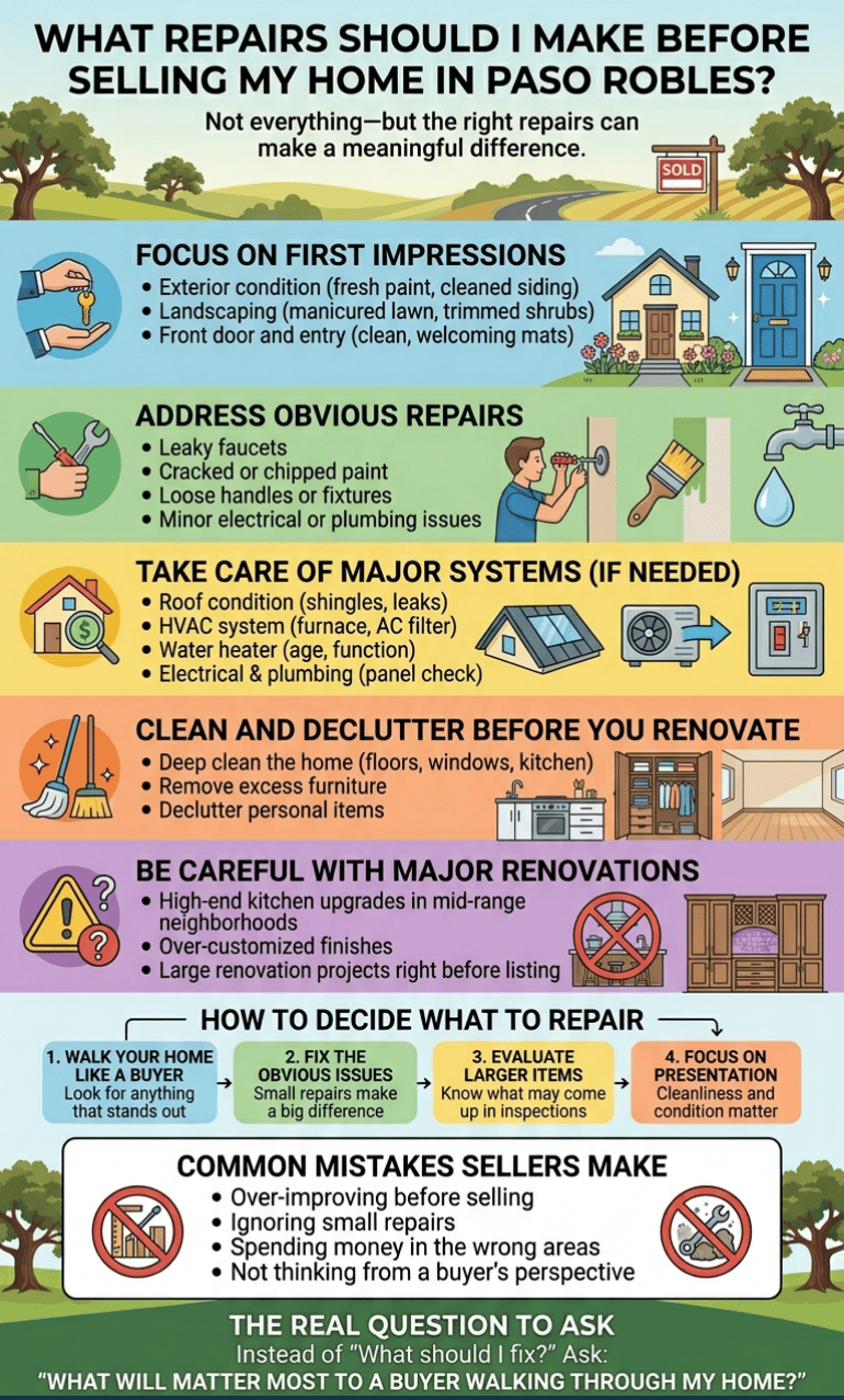 As a real estate agent in Paso Robles, CA helping buyers and sellers across San Luis Obispo County, I’ve seen sellers either overdo it and spend too much or skip important items that end up costing them later.