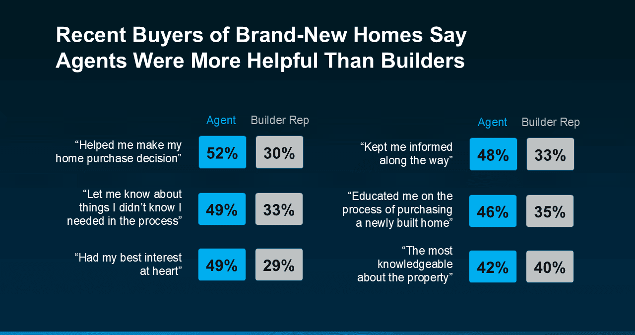 Maybe that’s why data shows homebuyers unanimously scored their agents higher than their builders when looking back on their recent purchase: