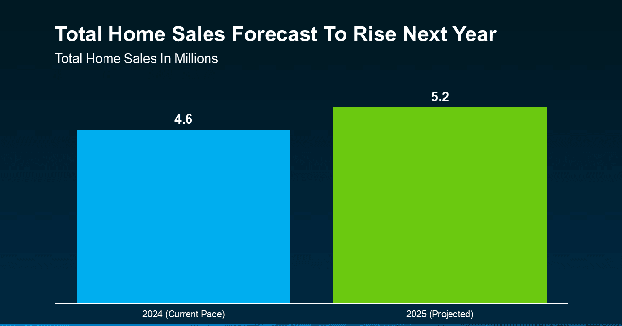 If history is any indicator, that means more homes will sell next year. And based on the latest forecasts, that’s exactly what you should expect. As the graph below shows, the housing market is on pace to sell a total of 4.6 million homes this year, and projections are for 5.2 million total sales next year (see graph below):