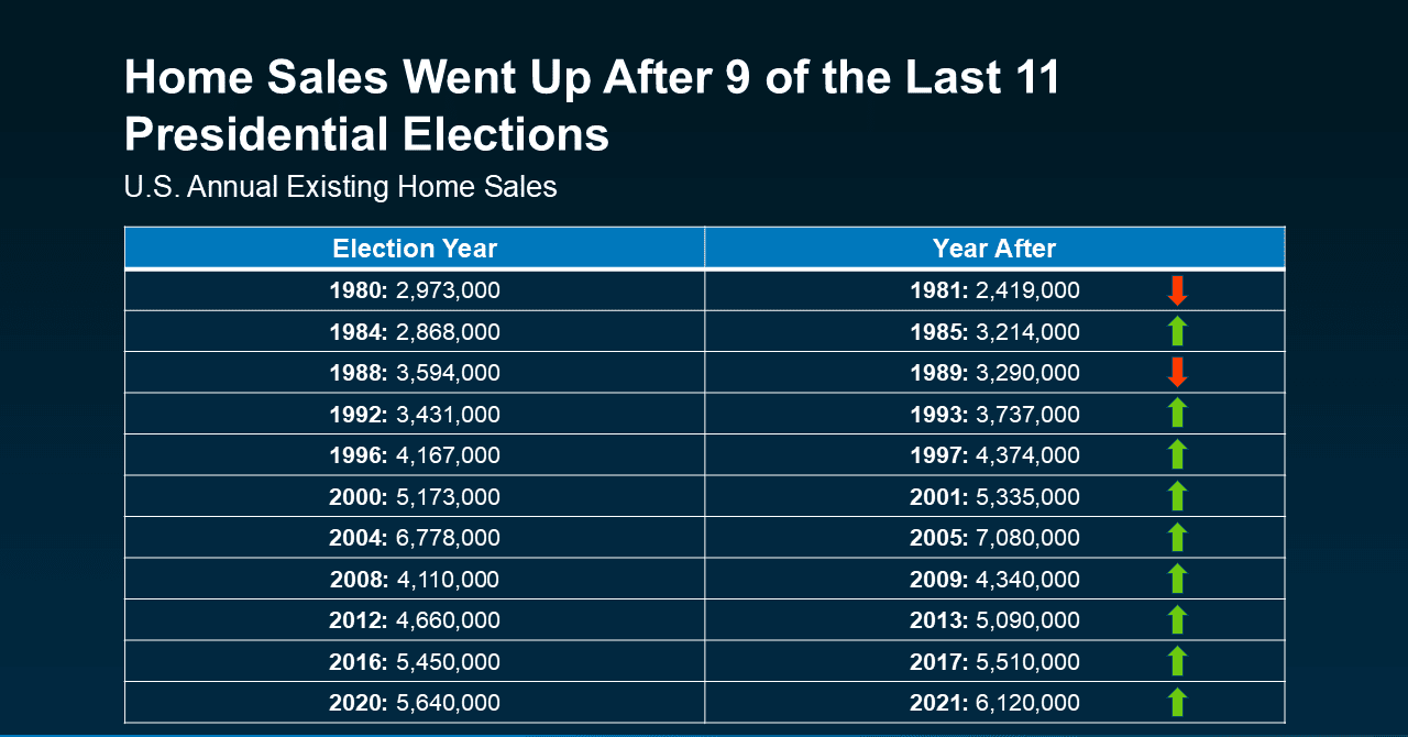 The good news is these delayed sales aren’t lost forever—they’re just postponed. History shows sales tend to rebound after the election is over. In fact, home sales have actually increased 82% of the time in the year after the election (see chart below):